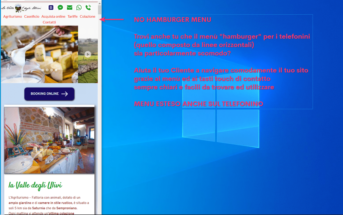 Anche sul telefonino, il menù di navigazione è sempre completamente aperto e leggibile, non si trasforma mai in "Hamburger Menu" (quel menu visibile nei telefonini composto da piccole linee sovrapposte) che spesso complica la navigazione invece di semplificarla.